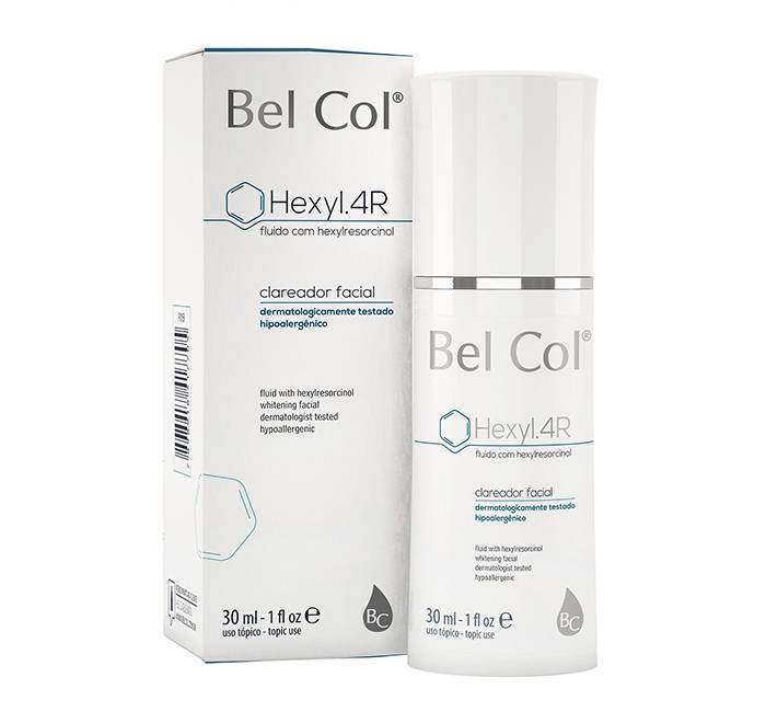 Com eficácia comprovada, o Hexyl.4R Fluido Clareador Bel Col promove o clareamento da pele com resultados perceptíveis em 28 dias de uso. Pode ser usado durante o dia e a noite, em qualquer estação do ano. Hexyl.4R é um produto dermatologicamente testado que promove clareamento com segurança para a pele.